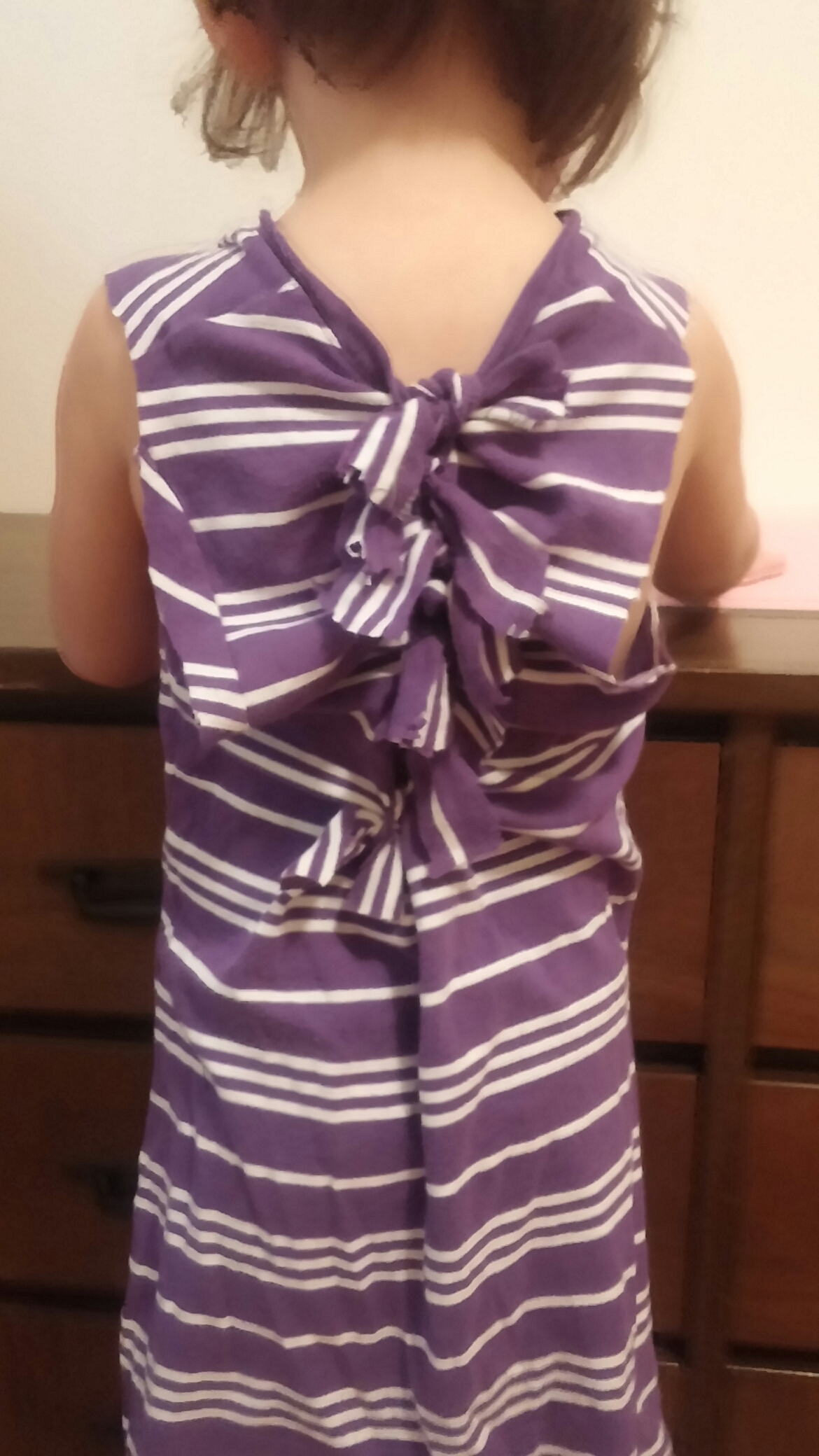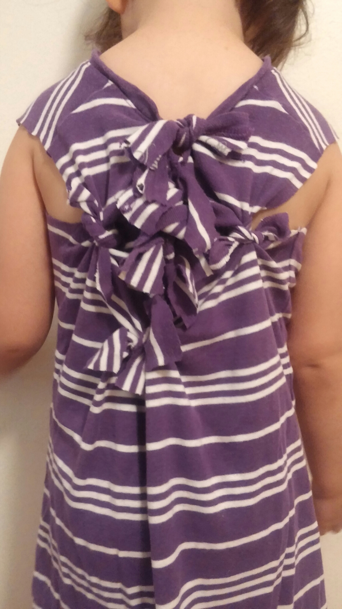 As you can see… I used terrible scissors. I then folded the shirt in half so that the side seams met. And then I cut strips up the back for the bows. Had her put it back on and tied to my desired tightness.